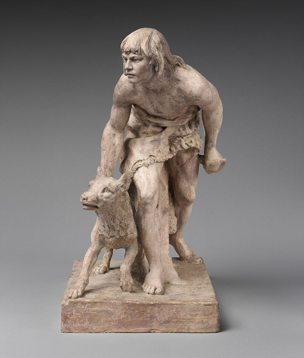 Preliminary maquettes (sketch models) for nineteenth-century American sculptures are relatively rare given their fragility and their transitory role in the process of sculpture-making. In this plaster, as in the edition of finished bronze statuettes (1973.257), Ward paid close attention to realistic anatomical form and textural detail in depicting a Native American man leaning forward in mid-stride tracking his prey and restraining his dog. The most significant compositional difference between this sketch and this finished bronze is the transition of the base’s shape from rectangular to oval. Ward later enlarged his model, making additional refinements resulting from an 1864 trip to Dakota Territory. A monumental bronze was dedicated in New York’s Central Park in 1869.