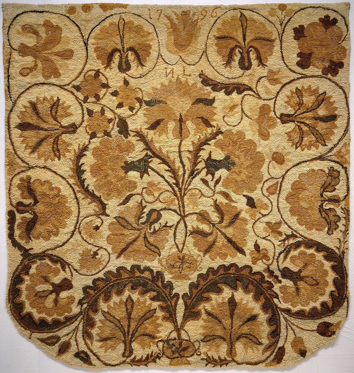 The bold, overscaled patterning of the typical bed rug is unlike most other embroidered bed coverings of the eighteenth and early nineteenth centuries. The thickness of the sewing yarns as well as the need to create a design that would be effective when made into pile contributed to the use of large motifs and to the pleasing appearance of the end result. The central motif of a bouquet of flowers growing from an undersized urn can be traced to the influence of the Tree of Life image commonly found on Indian palampores. The Tree of Life design inspired many quilt and coverlet makers, yet it was never used with such vigor as on bed rugs.