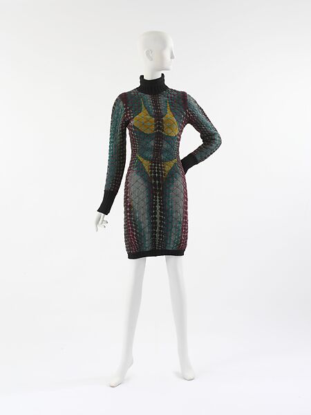 Jean Paul Gaultier's collection "Femmes Amazone" was accessorized, according to Women's Wear Daily, with "whips and sundry other Mad Max accessories." His inspiration, ostensibly, was the mythic Amazon and the contemporary equestrian. This dress is a version of the body-conscious sheathes he showed in the runway presentation under sweeping coats. With an ombréed and graduated dot pattern, Gaultier creates the illusion of a shadowed trompe l'oeil body wearing a bikini. The essential modesty of the padded and quilted sweater dress is subverted by this overprinted body, which emerges like an X ray, and by Gaultier's exploitation of the stretch of the synthetic knit to fit the dress like a second skin. Gaultier makes one of his whimsical references to the pop culture of his childhood in rendering the "itsy bitsy teenie weenie yellow polka dot bikini" of Brian Hyland's 1960 hit single.
