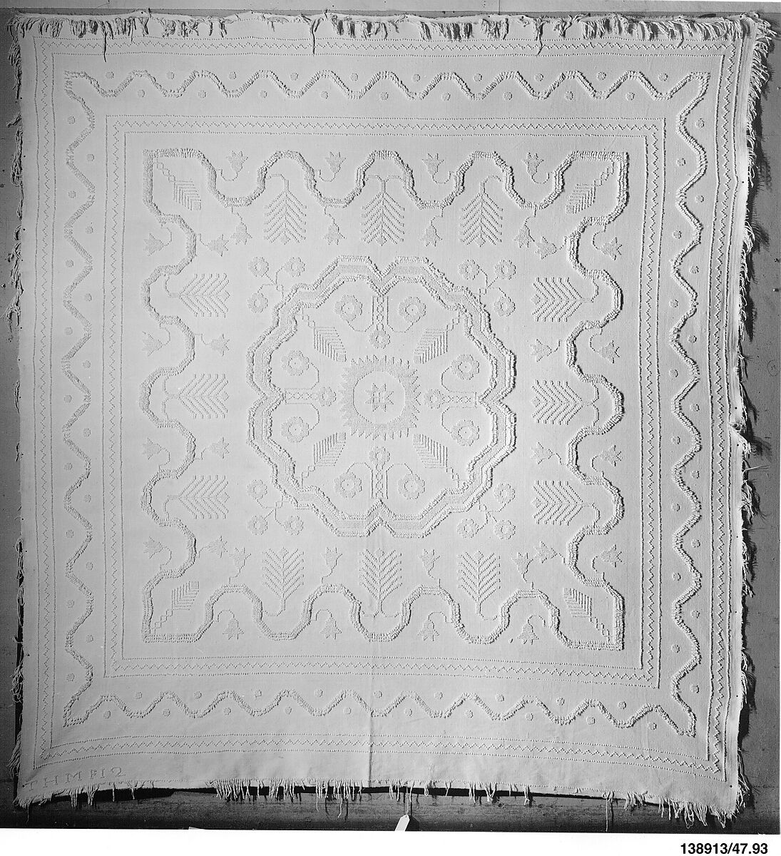 This hand-loom-woven white cotton bed cover was made in one piece. The design is picked out in raised loops of heavy cotton weft threads. The heavy pattern wefts are in a 1:z proportion to the lighter-weight main wefts. The small central eight-pointed star is surrounded by various borders. The piece is self-fringed on all four sides.