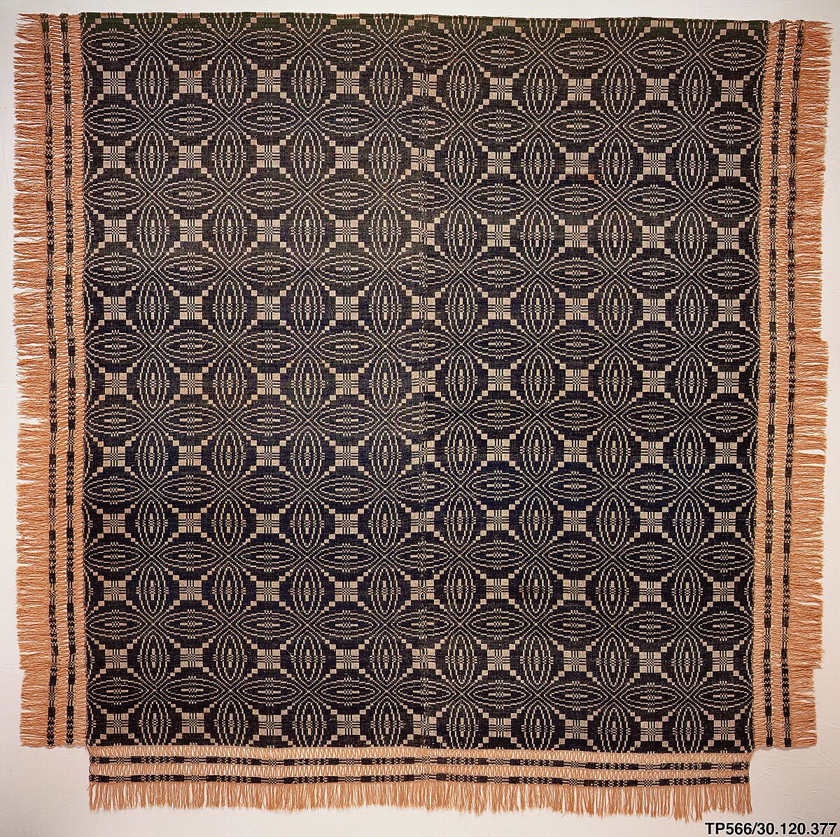 This Summer and Winter coverlet is woven of undyed cotton and dark blue wool in two panels and seamed at the center. It has natural woven fringe along the bottom border and applied woven fringe on the left and right sides.