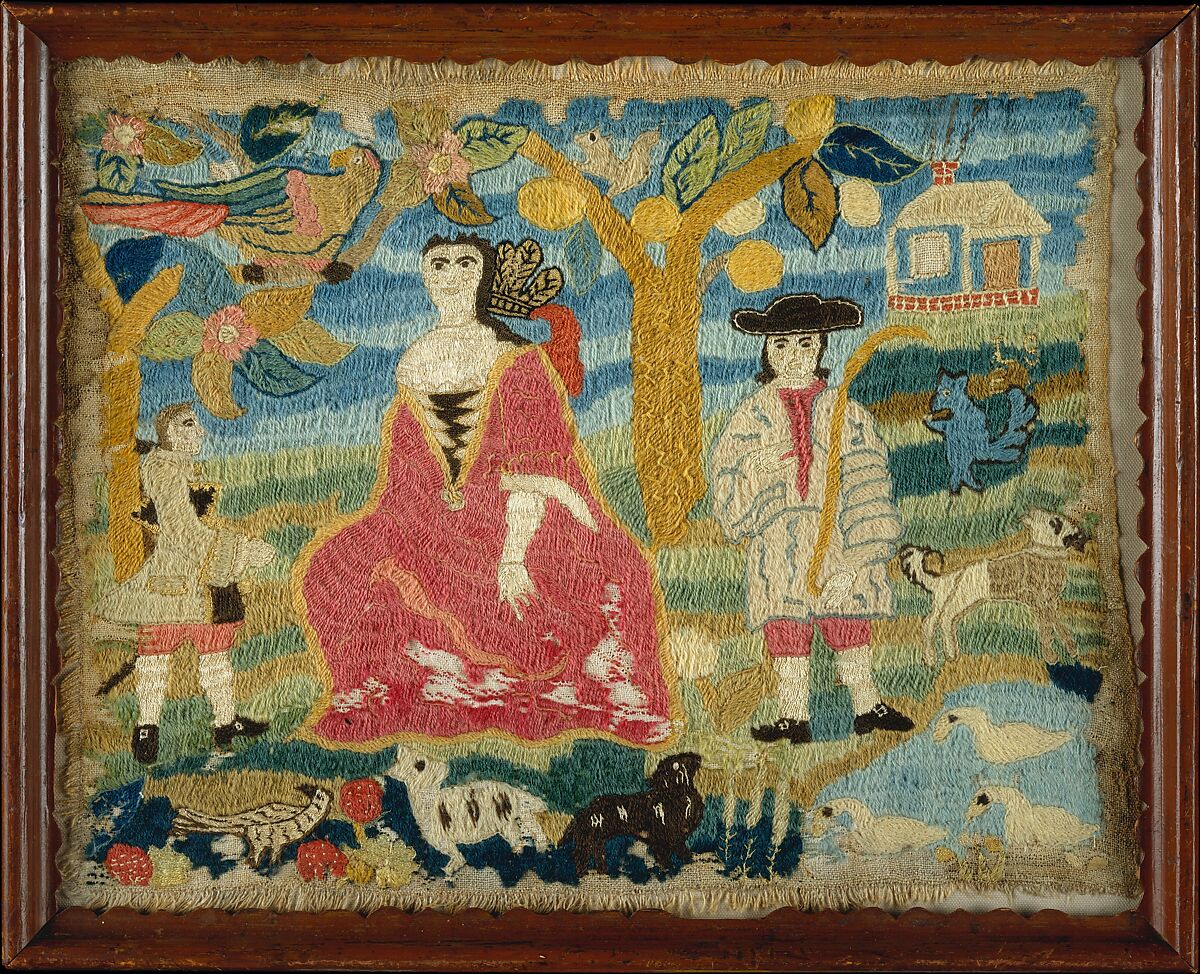 This piece is one of five known versions of this design completed by young ladies at school in Boston. All feature the rather large upright shepherdess with her smaller shepherd suitor in a black hat to one side. The Museum’s shepherdess traditionally has been called the Indian Princess because of what appears to be a feathered headdress peeking out from behind her hair. In the eighteenth century an Indian princess was an understood symbol for the American colonies.