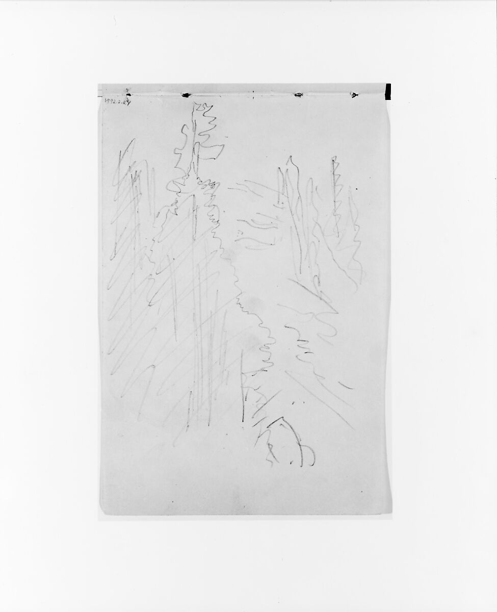 This sketchbook contains fifty-one drawings in graphite and ink, primarily of Pacific Northwest landscape and marine subjects. The addition to the Museum’s collection of this and one other sketchbook (1992.2.1) of New England and Pennsylvania landscape and marine subjects by Richards virtually completes a representation of the range of the artist’s graphic achievement. The books are remarkable for both highly finished compositions and for pages of rapid notes probably taken during strolls through the countryside. The pages testify to Richard’s tireless pleasure in observing nature, to the sketchbooks utility as a rehearsal place for his hand, and to the vivid impressions he could produce with the simplest of means. Not least of all, they offer a key understanding to the artist’s uncanny facility in his better known paintings and watercolors.