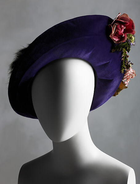 This work of art is currently on loan to the museum.Jeanne Lanvin, the founder of the oldest couture house in continuous operation, launched her prolific design career as a milliner in 1885. For more than twenty years she focused on hats, expanding into children’s clothing in 1908 and joining the French dressmaker’s union, signifying her entry to haute couture, the following year. Her company steadily thrived as she broadened operations to encompass bridal, furs, menswear, sportswear, fragrance, home furnishings, and costume for the stage. Although she garnered the most recognition for her romantic and exotic dresses, millinery remained a staple of the business, and several aspects of her approach to fashion design are clearly grounded in this early training. This includes a sensitive eye for embellishment, as reflected in the elegant sophistication and detail of this hat. The asymmetric style is composed from a swoop of purple velvet that has been encircled with a narrow cloud of mink at the crown. The brim is anchored with clusters of silken blooms that are arranged in a delicate equilibrium between top and bottom edge.