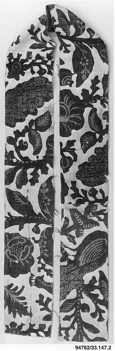 Blue-resist textiles are characterized by naturalistic designs in dark and light shades of indigo blue on a loosely woven white cotton ground. These designs were made by dipping the cloth in an indigo bath, rather than trying to print indigo directly onto the cloth. The repeating figures on blue-resist fabric were made by first covering areas of the white ground with wax that was sometimes mixed with other ingredients such as clay, starch and minerals that blocked (resisted) the penetration of the indigo dye. The largest areas of white were probably reserved by painting the wax freehand onto the white fabric, which had been lightly marked with the pattern that was to remain clear of the wax and therefore be dyed blue. The marking of the pattern could have been done with a wooden printing block or with a stencil. The first bath would dye the entire unwaxed pattern a light blue. The dyer then waxed over some of the light blue areas of the design and drew in wax the fine lines that defined certain details, called "pencil work" in the period. After penciling with wax was completed, the entire piece went into the indigo bath a second time, which turned all the still uncovered areas the deeper shade of blue.