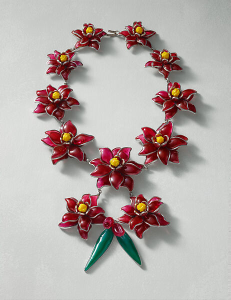 Gripoix became particularly admired for its sophisticated metal settings that framed floating glass to achieve a subtle effervescence. This design by Suzanne Gripoix for Chanel reflects the late 1930s vogue for romantic nature-based motifs with a wreath of graduated translucent flower heads. The boldness of the design is tempered by its naturalistic shapes that take the form of red dahlias, flowers with a host of symbolic associations that include dignity, eloquence, eternal love, fickleness, and the ephemerality of beauty.