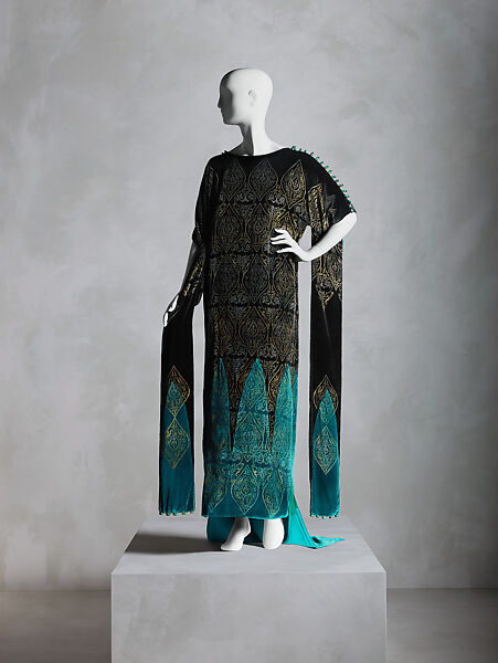 This work of art is currently on loan to the museum.Gallenga developed her own technique for metallic printing on velvet using wood blocks. These were produced for her quickly and at little cost by cutting her designs from thin wood blanks that were then glued to sturdier support blocks. To execute the printing, an adhesive film was applied to the blocks, which were then pressed onto the textile to replicate the pattern in adhesive. Powdered metallic pigments were brushed onto the treated areas, which allowed colors to be subtly blended into one another. In this tea gown, whose form imitates that of a medieval gown with hanging sleeves, transitions from silver to gold are made throughout the print, a pattern of birds and hounds set within pointed ovals resembling Gothic tracery. Variations in the tone of the metallic pigments were achieved by adjusting their composition, which typically included copper and zinc. Changing the ratio of these metals produced shades ranging from silver to gold, copper, and bronze.