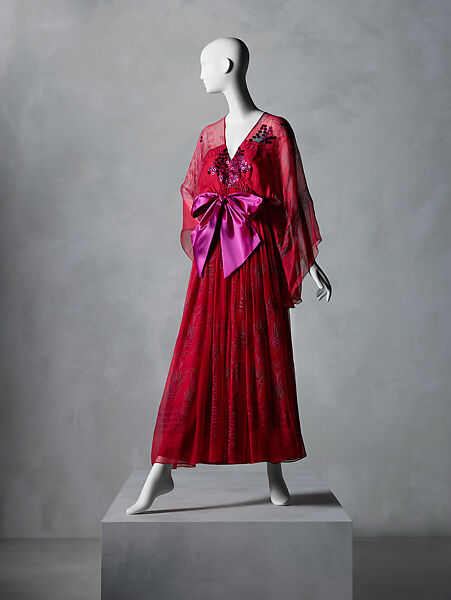 This work of art is currently on loan to the museum.This brightly hued dress hails from British designer Zandra Rhodes’s “Lily” collection for autumn/winter 1972–73. Rhodes initially trained as a textile designer at the Royal College of Art in London. Similar to the early twentieth-century artist Mariano Fortuny y Madrazo, she first ventured into fashion to find a suitable canvas to display her distinctive printed textile designs.