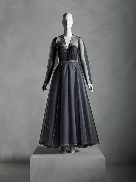 This work of art is currently on loan to the museum.New York-based couturière Valentina prized creative independence from the Paris fashion industry and, indeed, created a singular style that was recognizably hers. Valentina’s designs are pragmatic, with both a timeless quality that allowed them to outlast seasonal trends and a structure that does not constrict movement or reshape the figure; they are technically superb, with precisely placed and carefully executed seams and finishing details; and they have undeniable allure, owing to the designer’s attentiveness to the individual wearer’s body. To flatter each figure she dressed, Valentina focused on simple lines, undisturbed by extraneous embellishment, as she equated “absolute simplicity” not with plainness but rather with modern glamour. This dinner dress exemplifies her striking but disciplined aesthetic, with its meticulously sewn but unadorned overskirt and bodice of sheer net that sensually grazes and subtly exposes the arms and décolletage.