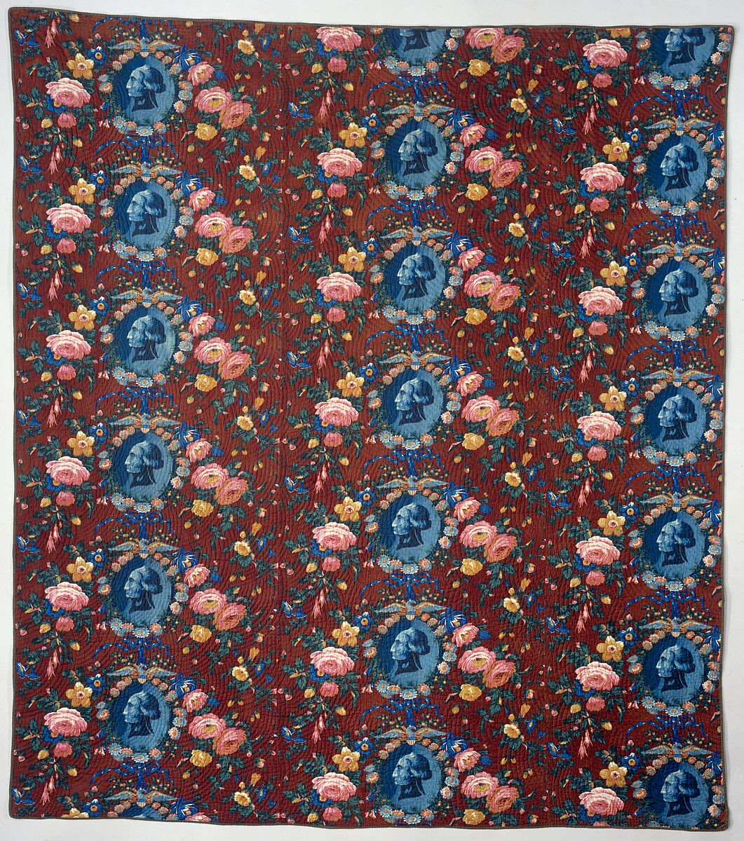 George Washington's image appeared on many textiles, the earliest being eighteenth-century copperplate-printed fabrics. The craze for Washington's image may have reached its height in 1876, when the nation celebrated its Centennial. This quilt's cotton fabric, roller printed with trompe l'oeil relief busts of the Father of Our Country, was most likely printed in America for the Centennial. (For another example of Centennial fabric depicting Washington, see 48.158.8). Although the quilt’s fabric has been published as dating from about 1850, the subject matter, the inscription noting "WASHINGTON and INDEPENDENCE/ 4th July 1776," and the fact that our quilt is backed with a calico of the browns and reds that seemed so overwhelmingly popular in the 1870s, all make us believe that the fabric, and therefore the quilt, can be dated to about 1876. Another version of the same design also thought to be from about 1876 exists in the J. Doyle Dewitt Collection of the University of Hartford. That piece of fabric is linen, printed in red, white, and blue. The inscription, which differs slightly from ours, reads: "Union/ Independence/4 July 1776". The invocation of Union surely means that the fabric had to have been designed at some point after the beginning of the Civil War.