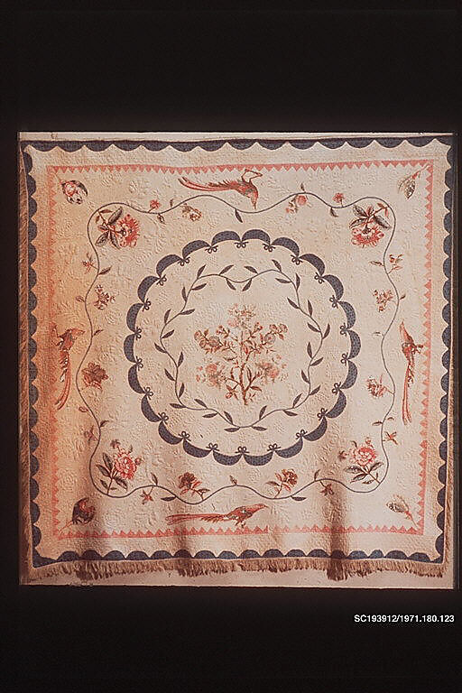 This quilt has a central flowering tree of appliquéd chintz, surrounded by appliquéd blue and pink calico vines, swags, and sawtooth and scalloped borders. The outermost border is shell quilted, while the inner area is quilted with roses, leaves, vines, and grapes. There are some modern replacements to the chintz areas. A cotton fringe is attached on three sides. The back is of plain white woven cotton.
