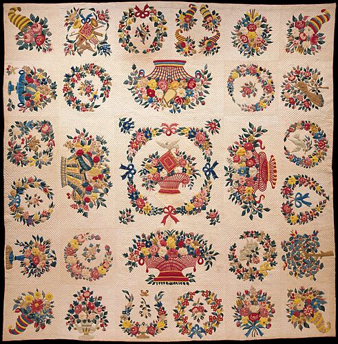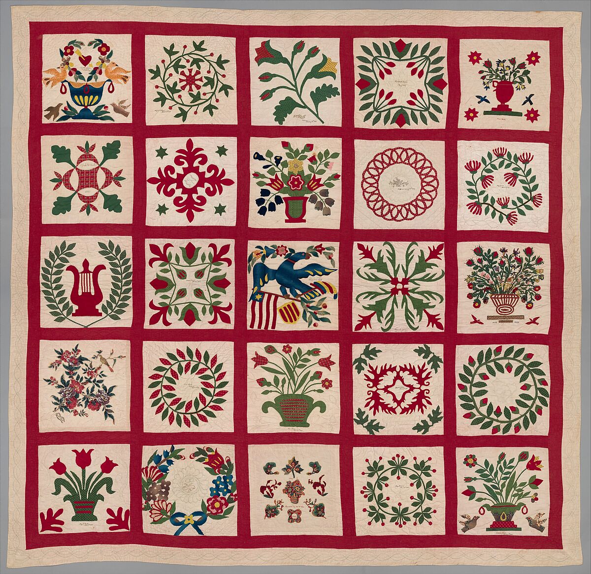 The Museum was given this lively Baltimore quilt in 1988. It is a true Album quilt, since almost every block is signed and dated by a different person, unlike our other, more sophisticated Baltimore quilt (1974.24) which is thought to be the work of a single maker. Most of this Album quilt's blocks were appliquéd by members of the Brown and Turner families. Some of the blocks are decorated with motifs that are typically found only on Baltimore quilts, such as the central eagle and flag, while other designs, such as those that employ the cut-paper technique, can be seen on Album quilts from all regions of the country.