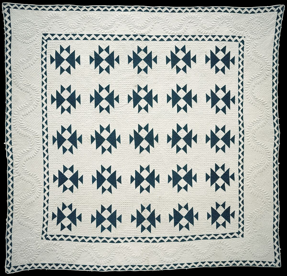 This is a simple quilt, but in its simplicity, it is an object of great beauty. The front and backing are of plain white cotton, and the diamond-set blocks and narrow zigzag borders are pieced with a dark blue cotton printed with a tiny white dot. The quilting is very fine, with a particularly beautiful feather-vine border that terminates at each of the corners in a feather wreath. In the lower right corner, the feather wreath contains the quilted inscription: "R M/1849."