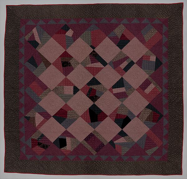 The This Crazy quilt illustrated here was made in the later decades of the nineteenth century, when a wide variety of silks were being pieced into Quaker quilts. The quilt has a mate also in the Museum collection (2021.244). The overall composition, fabrics, and quilting techniques are the same in the two quilts. In addition to the solid-colored silks in the characteristic Quaker shades of browns, beiges, and grays, the quilt also includes bits of printed silk, as well as cut and uncut velvets. The wool backing and cotton quilting thread are a surprisingly bright red. For unknown reasons, Crazy quilts were popular with the Quakers, although their versions are quite subdued and orderly. The virtuoso quilting, traditional to this group, also sets this work apart from Crazy quilts made by non-Quakers.