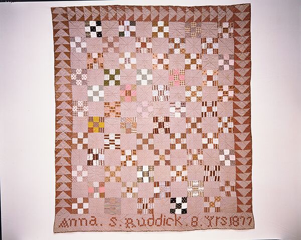 It is believed that Anna Ruddick made both the unsigned Log Cabin crib quilt (1976.198.2) and this signed Nine Patch quilt. The fabrics used to construct it can be dated to the 1870s, the period when Anna would most likely have sewn it. Although not as beautifully made as the one in the collection by her mother, Susan Reed Ruddick (1976.198.1)--it must be kept in mind that Anna was only eight years old when she pieced together this quilt. Yet, it is obvious that she looked to her mother’s quilt for inspiration. Anna’s mother died twelve days after giving birth to her in 1869 and subsequently, Susan’s mother, Elvina Reed, moved to Monticello, New York to take care of her granddaughter. She remained there until Anna’s father, John Ruddick, remarried in 1881.