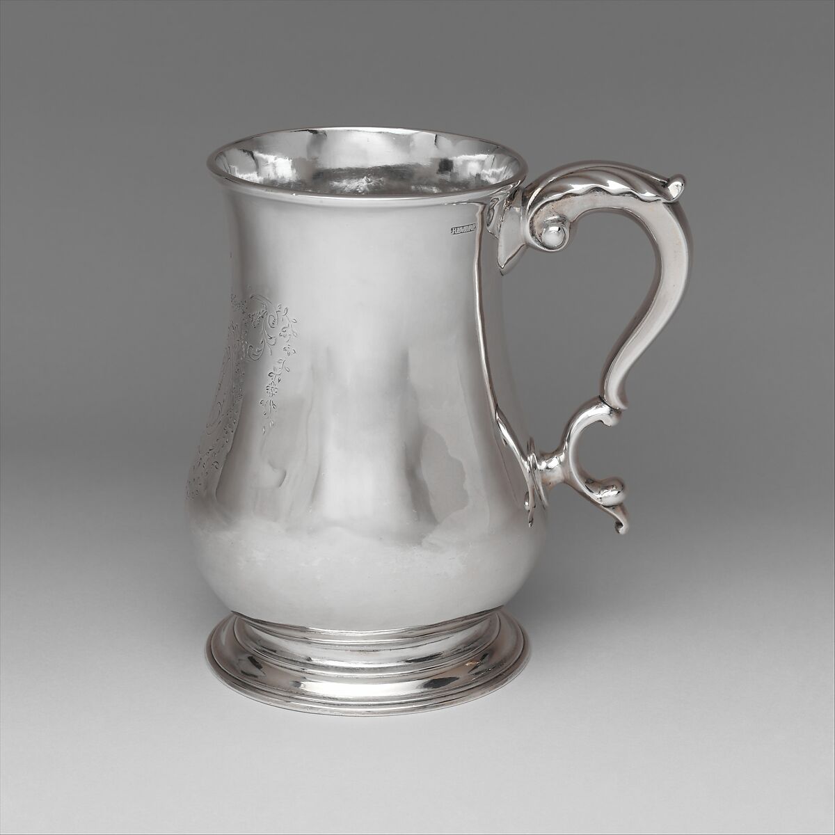 Cann, a term used interchangeably with mug during the eighteenth century, refers to a pear- or tulip-shaped drinking vessel with scroll handle and circular foot. This exceptionally large pair was made for Elias Hasket Derby (1739–1799) and his wife Elizabeth, whose interlaced script monogram, EHED, is engraved on the front of each. Derby was a wealthy shipping merchant in Salem, Massachusetts. In April of 1783, Revere recorded in his ledger that he was making a pair of "quart canns for E. H. Darby, Esq." A set of silver beakers by Revere (58.3.1-.4), as well as several pieces of furniture and Chinese export porcelain in the Museum's collection, also belonged to Derby.