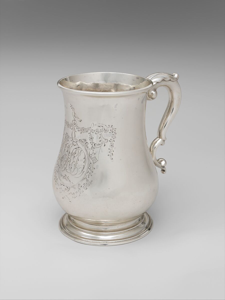 Cann, a term used interchangeably with mug during the eighteenth century, refers to a pear- or tulip-shaped drinking vessel with scroll handle and circular foot. This exceptionally large pair was made for Elias Hasket Derby (1739–1799) and his wife Elizabeth, whose interlaced script monogram, EHED, is engraved on the front of each. Derby was a wealthy shipping merchant in Salem, Massachusetts. In April of 1783, Revere recorded in his ledger that he was making a pair of "quart canns for E. H. Darby, Esq." A set of silver beakers by Revere (58.3.1-.4), as well as several pieces of furniture and Chinese export porcelain in the Museum's collection, also belonged to Derby.
