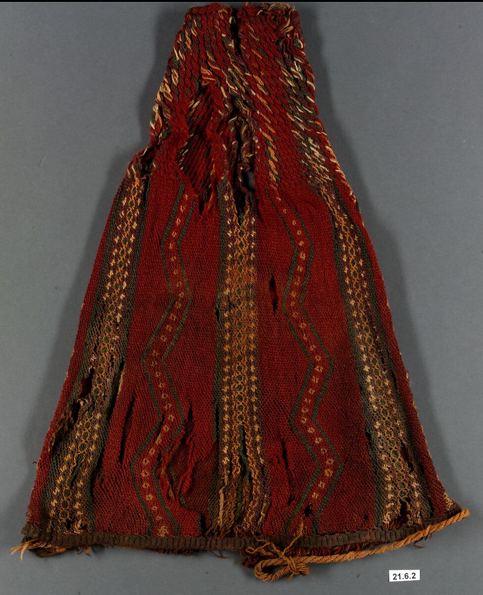 Although frequently found in cemeteries, hats such as this example, are rarely recognizably depicted and thus their use is poorly understood. The bag-shaped hats are probably earlier than the tapered examples. The hat is worked in the sprang technique, which produced expandable networks.