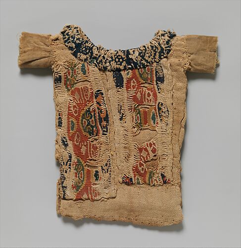 - Medium:Tapestry weave in purple-colored, red-brown, and undyed wool on plain-weave ground of green wool; fringes in green and red-brown along the perimeter of the hood and lower edges