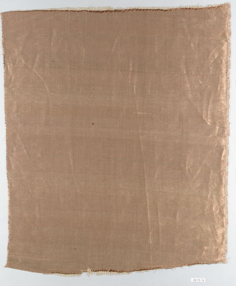 Before the 1880s it was difficult for American decorators to obtain quality fabrics from local textile manufacturers. By working with the Cheney Brothers mill (1838-1955), Candace Wheeler (1827-1923) was able to create innovative new textiles that fit her artistic vision. Among them were metallic cloths, which she used as the ground fabric for some of her most luxurious hangings. This copper-toned example was woven from a warp of tan silk and a weft of copper threads composed of finely cut strips of copper sheeting wound around a red-dyed cotton core. Wheeler and the Cheney Brothers also produced metallic cloths with the appearance of silver and gold.