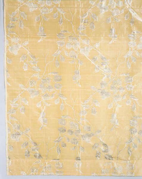 Like the pinecones-and-needles fabrics (28.70.6), this quince-patterned fabric utilizes a pale palette of creams and golds that shimmer as light shines on the folds of the cloth, and is woven of fine silk yarns. In this case, the weave is a complex damask. The quince panel was a gift from a member of the Cheney family, by whom it had been regarded, perhaps inaccurately, as the work of Associated Artists. The pattern is more refined and more realistically drawn and shaded than most of the firm’s designs. The fragile silk fabric has sustained damage caused by light, age, and possibly the method of silk processing at the mill