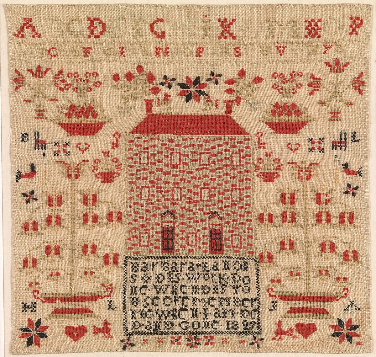 Compared to Barbara Beiler's sampler made seventeen years earlier (34.100.216), Barbara Landis's example shows more of the influence of her English-speaking neighbors. Barbara Landis was a member of the Mennonite sect, and German would have been spoken in her home. Her family, however, must have had some interaction with neighbors outside their immediate group, since Barbara's rather awkwardly spelled motto is traditionally found on samplers made by girls who lived in Pennsylvania's English community. The use of a house as a central motif is also very rare in Pennsylvania German samplers and again illustrates links Barbara must have had with the wider world.