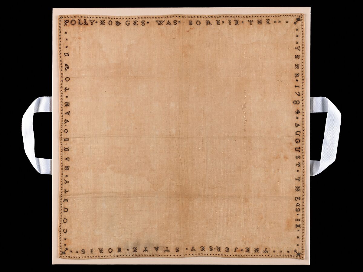 Mary Hodges, called “Polly” (a common nickname at the time for girls named Mary) was born in Hanover Township, New Jersey, on August 13, 1784. This was the year the Continental Congress ratified the Treaty of Paris officially establishing the United States as an independent and sovereign nation, so Polly was a member of the first generation of women to live in the new Republic. She was the first of four children born to Samuel Hodges (1755-1826) and Rebecca Smith Hodges (1762-1845). When Polly was 21, she married Caleb Dustin (1782-1821) of Bernardston, Massachusetts, on February 1, 1806. They had one daughter, named Mary Helen, born on December 9, 1806 in Enfield, New Hampshire where Polly and Caleb were then living. Sadly, Polly died twelve days later, on December 21. Before the discovery of antibiotics, it was far too common for young women to die of infections following childbirth. Polly and Caleb’s daughter, Mary Helen, lived with her father until his death in 1821. When she was 50 years old, she married Thaddeus Clapp (b. 1811), a fruit grower, and lived in Dorchester, Milton, and Boston, Massachusetts, until her death in 1890, aged 83. Throughout her long life, Mary Helen may have been the keeper of her mother’s handkerchief, never knowing that this personalized keepsake would one day enter the collection of the Metropolitan Museum, thus documenting her mother’s short life.