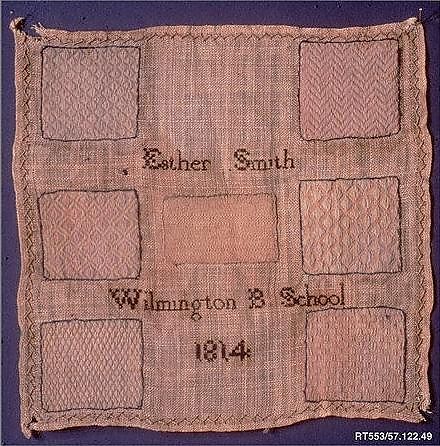 The earliest known darning samplers have roots in eighteenth century German-speaking Europe and spread to Northern Europe and England by the end of the century. During the opening decades of the nineteenth century American Quaker schools like Westtown in West Chester, Pennsylvania, required their girl students to master darning techniques. Several of the needlework teachers at the Wilmington Boarding School had taught at Westtown, and the darning samplers from both schools share similarities in design and patterns. All the known darning samplers from both schools have a central inscription of the name of the maker, her school, and the date in the middle of the sampler.