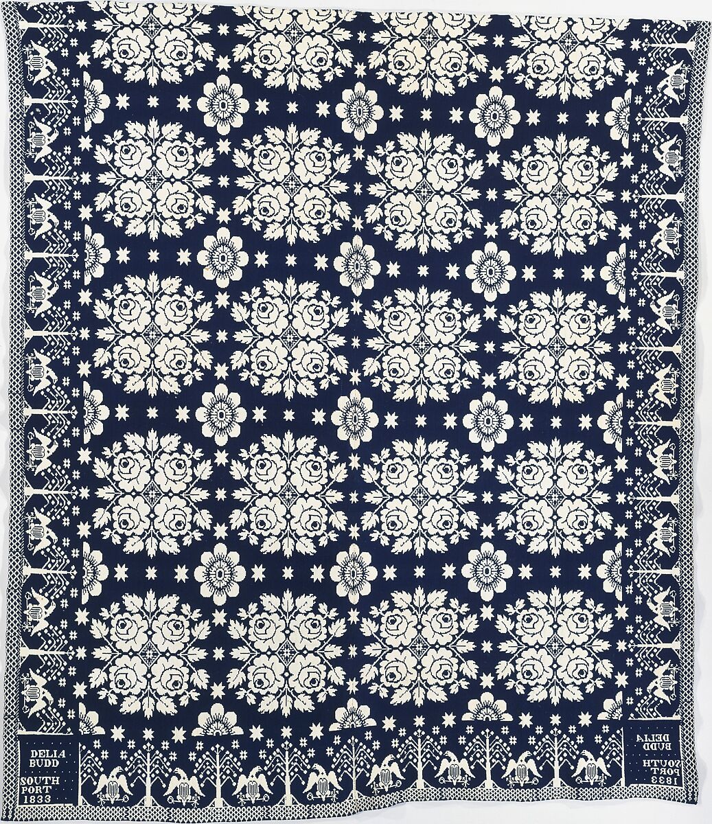 This dark blue wool and undyed cotton coverlet is woven in two panels and seamed at the center. The central field is patterned with quadrupled rose medallions, while the borders show alternating eagles and fruit trees.