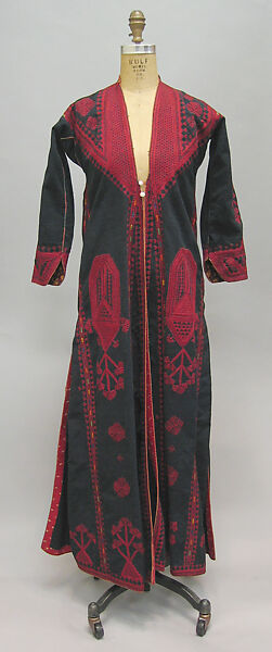 Many designs and motifs featured on Syrian clothing are important indicators of local cultural, social, and probably religious identity. This coat composed of black cotton with primarily red silk thread embroidery is most likely from the rural areas in northwestern Syria. It features traditional designs among floral patterns and stylized trees that represent the tree of life motif or bolt oval medallions, particularly on the front of the coat. Inner linings of printed cotton are typical of Syrian embroidered coats. These linings are also found on the neckline or sleeve’s openings.