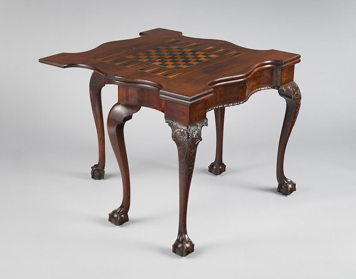 The upper playing surface of this rare tripletop gaming table is inlaid with patterns of backgammon and chess boards; the lower one is lined with baize for playing cards. Otherwise, the table is characteristic of a small group of New York card tables with bold serpentine fronts.