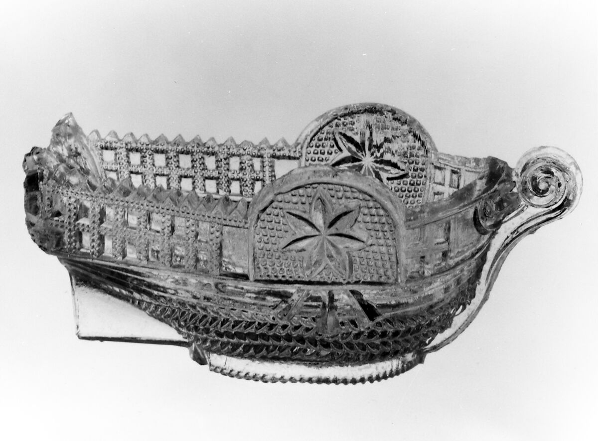 The salt is in the shape of a paddle-wheel steamship. The design of this salt maybe copying a similar salt made by the Boston and Sandwich Glass Company (46.140.314). Pittsburgh salts of this shape are quite rare.