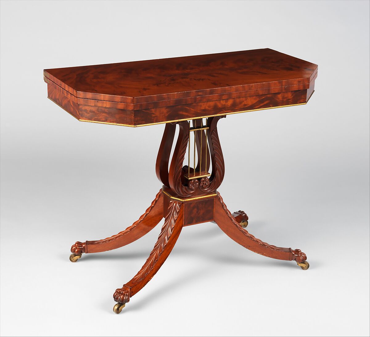 At the time when this card table was acquired from the collection of Louis Guerineau Myers, one of the great early connoisseurs and collectors of American furniture, it was attributed to the shop of Duncan Phyfe. The table bore that association for many years due to its elegant design and superb workmanship. Without documentation or any history of family ownership, however, it is difficult to justify assigning the table to the Phyfe shop. Recent scholarship has shown that as many as 300 cabinetmakers were at work in New York City in any given year between 1810 and 1820, and many of them were capable of rendering high-quality wares in this distinctive New York regional style.