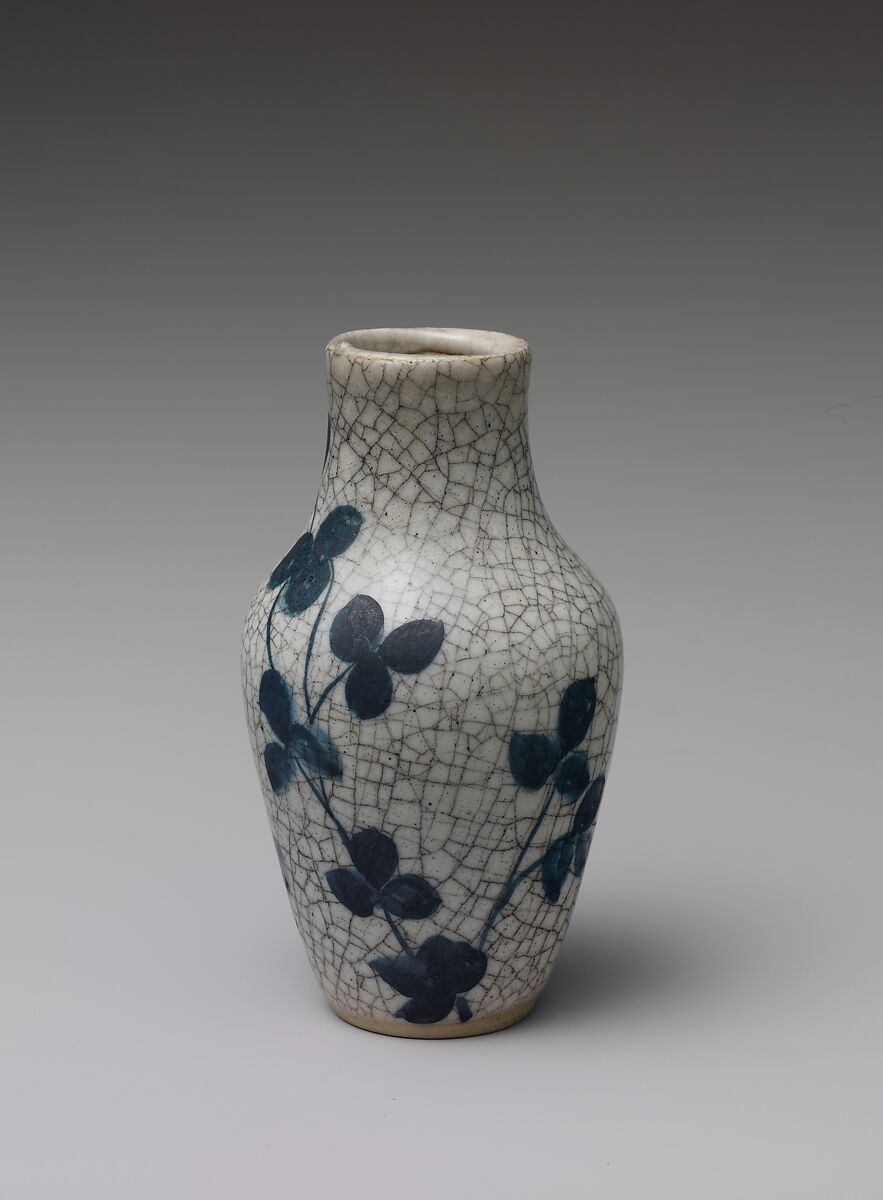 The crackle glaze found on this vase was the result of numerous experiments with glazing undertaken by Hugh Robertson in the late 1880s at the Chelsea Keramic Art Works that were derived from his fascination with the glazes he saw on Chinese ceramics. This glaze was the predecessor to the commercially successful “Crackleware" developed by Robertson in the 1890s when he was working under new owners, that after 1895 would become known as the Dedham Pottery. For other examples of Chelsea Keramic Art Works pottery see 69.35, 69.38.1, 69.38.2, 1982.440.1–.4, and L.1983.52.
