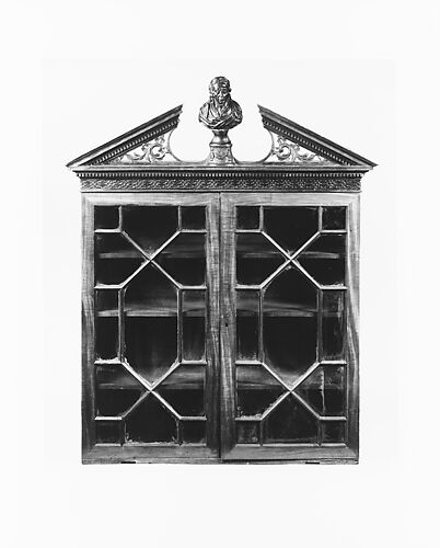 The placement of busts of learned men in libraries is a tradition that dates from antiquity and proliferated in eighteenth-century Philadelphia. The likeness of the English philosopher John Locke (1632–1704) was a preferred subject that often ornamented the pediment tops of desks and bookcases. This example has a distinct naturalism in the sculpting of the philosopher’s features that may have been inspired by well-known prints. Americans esteemed Locke for his philosophies that endorsed individual conscience, religious tolerance, and the defense of democracy. Locke’s theories were fundamental to the thinking of American Revolutionaries, especially the authors of the Declaration of Independence.
