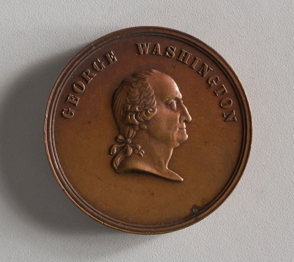 The obverse shows a bust of George Washington in profile. On the reverse is an inscription within an olive branch wreath tied with a bow at the bottom.