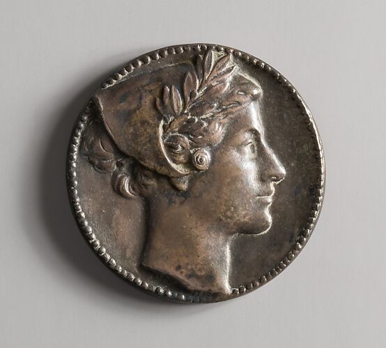 French undertook his first numismatic commissions in the mid-1890s, paralleling a flowering of interest in commemorative medals by Beaux-Arts-trained American sculptors. He earned the order for the Catskill Aqueduct Medal through Robert de Forest, president of the board of trustees of the Metropolitan Museum of Art upon which French also served (1903–31). De Forest was also president of the Mayor's Catskill Aqueduct Celebration Committee, convened to honor the completion of a 163-mile system to bring fresh drinking water from the Catskill Mountains to New York City. The obverse depicts the profile head of a young woman crowned with laurel, an allegorical head of the City of Greater New York. On the reverse, a naked male youth pours water from a vessel against a faint outline of the Catskill Mountains in the background. French was aided by his former studio assistant Augustus Lukeman in the design and modeling.