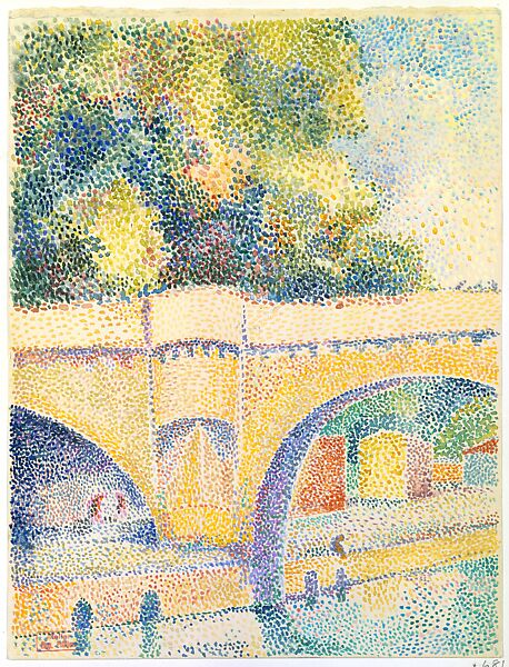 Hippolyte Petitjean mastered to perfection the Neo-Impressionist technique pointillism. A close friend of Georges Seurat, Petitjean took up Neo-Impressionism in 1886, and later exhibited on a regular basis with fellow practitioners. Although he gave up working in divided color for some years before the turn of the century, he resumed the dot technique around 1912, when he painted this luminescent watercolor. In his late watercolors, Petitjean used widely spaced round dots of pure color, leaving much of the paper surface untouched. This delicate pointillist sheet, glistening with light, was made along the Seine, looking downriver through the arches of the Pont Neuf toward the bathing cabins and trees by the place Henri IV.