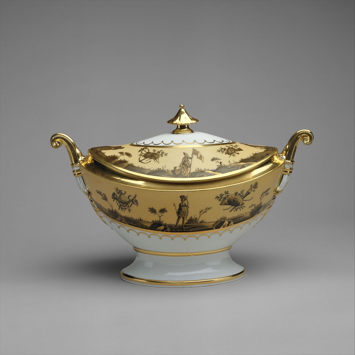 This now-partial dinner service originally contained more than 125 pieces, including dinner and soup plates, sauceboats, tureens, platters, serving dishes, and butter dishes on stands. Porcelain dinner services made in Europe and Asia for the American market typically included motifs that resonated with consumers in the United States.