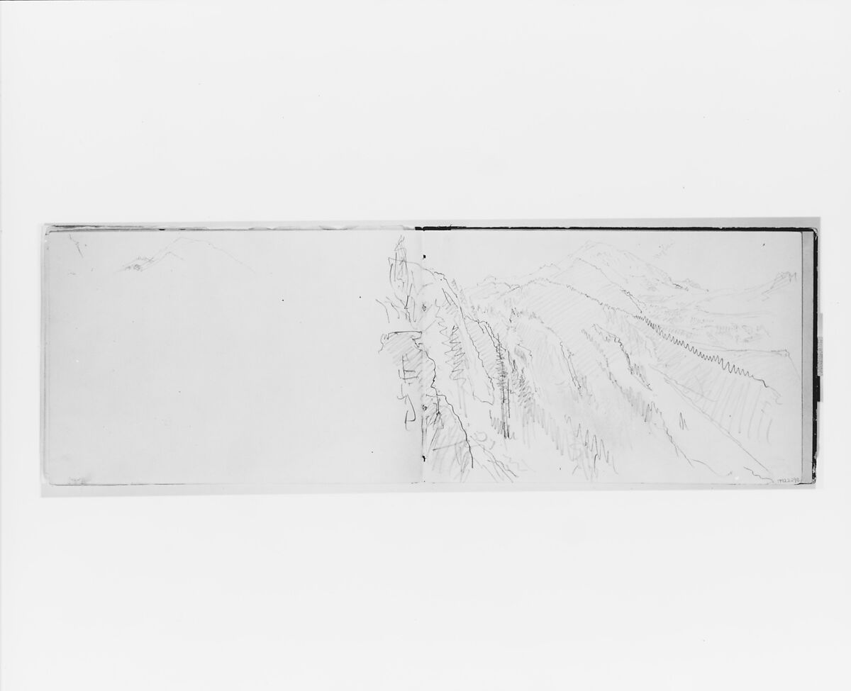 This sketchbook contains fifty-one drawings in graphite and ink, primarily of Pacific Northwest landscape and marine subjects. The addition to the Museum’s collection of this and one other sketchbook (1992.2.1) of New England and Pennsylvania landscape and marine subjects by Richards virtually completes a representation of the range of the artist’s graphic achievement. The books are remarkable for both highly finished compositions and for pages of rapid notes probably taken during strolls through the countryside. The pages testify to Richard’s tireless pleasure in observing nature, to the sketchbooks utility as a rehearsal place for his hand, and to the vivid impressions he could produce with the simplest of means. Not least of all, they offer a key understanding to the artist’s uncanny facility in his better known paintings and watercolors.
