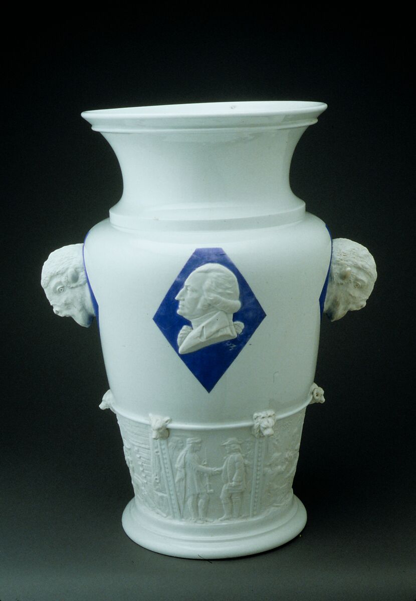 The “Century Vase” is one of several large works designed by the German sculptor Karl L. H. Müller for the Union Porcelain Works booth at the Centennial Exhibition held in Philadelphia in 1876. It was originally intended to be displayed on a porcelain pedestal, also designed by Müller. George Washington’s profile is featured on the front and back of the vase, flanked by bison-head handles. Six relief panels portraying scenes from American history, including the Boston Tea Party and William Penn’s treaty with the Lenni Lenape, encircle the base. The unfinished vase lacks the painted scenes of American industrial progress found on two of the other large-scale other examples.