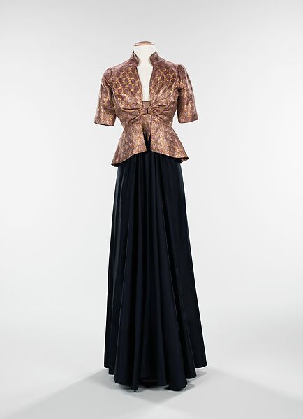 This dress, aptly titled "From the Arabic", shows Hawes' interest in other cultures. The non-traditional choice of fabric, typical of Hawes design aesthetic, is an Isamic-inspired textile. In creating this elegant evening ensemble, she has employed a beautiful lamé accented with boteh as the bodice of the dress and entire jacket. The detail at the center front of the bodice of the dress is a similar form to that of metal decorative ornaments from the same culture and it appears as if it catches the fabric of the halter-style bodice, creating a gathered effect. At the bottom of the appliqué, the skirt is tucked at either side of the point and gathered, creating a three-dimensional effect. The back of the dress is cutaway exposing much of the wearers back. According to the accession records the dress was originally designed with lacing for the back closure, yet the donor has applied buttons to suit her taste.