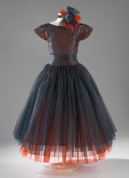 In a departure from the classically inspired and sculptural evening gowns for which she is well known, Grès recreates a silhouette reminiscent of the ballerinas painted by Edgar Degas (1830-1917). In her translation, she replaces layers of cream tulle with a multicolored composition in organza. An overlayer of black covers tiered layers of blue, copper, and orange. The skillful placement of the underlayers creates an iridescence that is backlit with an orange glow. The black neckband, a detail often seen on many of Degas' dancers, is reproduced here adorned with multiple oversized organza bows.