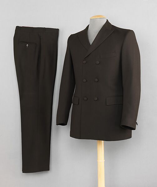 Made in France, this handsome suit features the narrow pant legs fashionable at the time. The self-covered buttons create a monochromatic look and highlight the richness of the color and quality of the fabric. The old gold figured lining with stitching detail (not seen) is another mark of aesthetic elegance.