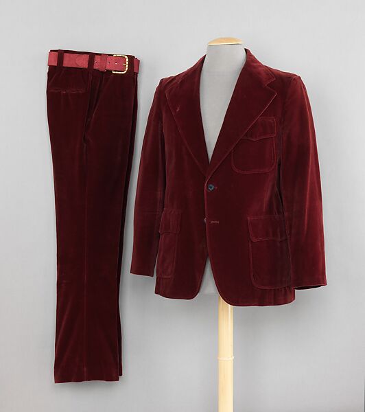 Claret velveteen is not a standard men's suiting fabric and the decorative printed lining is vogue for the period. But this suit, worn by a man interested in the style of the time, is relatively traditional in its construction; particularly worth noting is that the pants are cut with narrow legs rather than in the popular bell-bottom style.