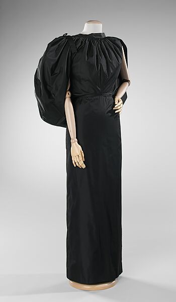 Madame Alix Grès' career spanned five decades and throughout them all she excelled in her ability to manipulate fabric and use its innate characteristics to enhance her designs. Known for her classically inspired, form-fitting silk jersey evening gowns, which she introduced in the 1930s, Grès also experimented with taffeta, using it to create smooth, shell-like surfaces as well as billowing, extravagant details. Here, the long narrow skirt presents an unbroken tube of fabric that extends up into an exaggerated blouson bodice. The bodice, draped and gathered at front, gives way to an enormous bubble of fabric in the back. Interpreted in taffeta, the bodice back resembles a pop art soft sculpture in the style of Claus Oldenburg (1929). It is a testament to Grès' skill that she is able to create both the clinging rose crepe evening gown with classical himaton wrap (2009.300.34) and this more audacious dress within consecutive seasons.