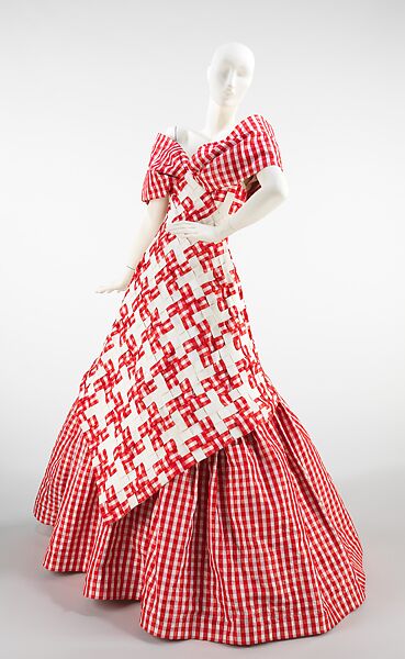 Arnold Scaasi, the designer of this ball gown, is best known for his evening wear designs, worn by a long list of celebrity clients primarily during the 1960s through the 1980s. Scaasi's work incorporates lavish surface decoration, often in the form of floral trimming, bright colors and full silhouettes that extend the proportions of the body. Scaasi creations are rarely easy to ignore; their ostentatious quality has become a signature of the designer's work. In this example, the interweaving of gingham and plain ribbons is a masterwork of innovation fabrication. The creation of a secondary houndstooth check motif via the interwoven ribbons, adds surface interest and visual complexity to the dress. The use of a humble gingham check for a ball gown shows the designer's sense of whimsy and gives the design a uniquely American sensibility.