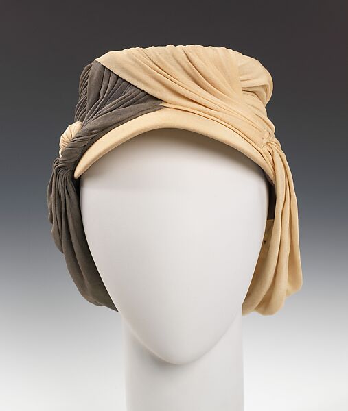 The French Foreign Legion wore a hat that covered the neck with a piece of fabric called a havelock and shielded the face with a visor. Also known as a kepi, the hat inspired many a fashionable interpretation, particularly during wartime. This version, designed during WWII, features jersey twisted into the chic kepi-like form, an example of Victor's talent for manipulating materials into stylish designs. It is also an example of Victor's propensity for drawing from outside sources, such as traditional military headwear in this case, for her designs.