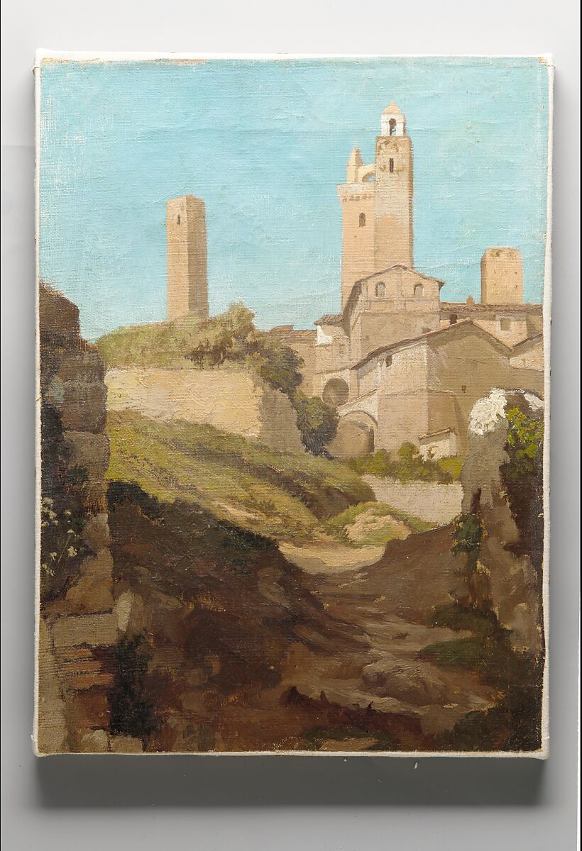 While studying in Paris in the late 1850s, Vedder became disappointed with French academicism and decided to travel to Italy to study the work of the Italian masters. In Florence, he frequented the Caffè Michelangelo, where he met a group of young, predominantly Tuscan painters known as the Macchiaioli, who eschewed the formalism of the Accademia in favor of a more spontaneous, plein-air style inspired by nature. Vedder’s view of San Gimignano, a picturesque medieval hill town in Tuscany noted for its high bell towers, or campanili, reflects his association with the Macchiaioli and his enduring appreciation for the landscape of Italy, where he settled in the 1860s for the rest of his life.