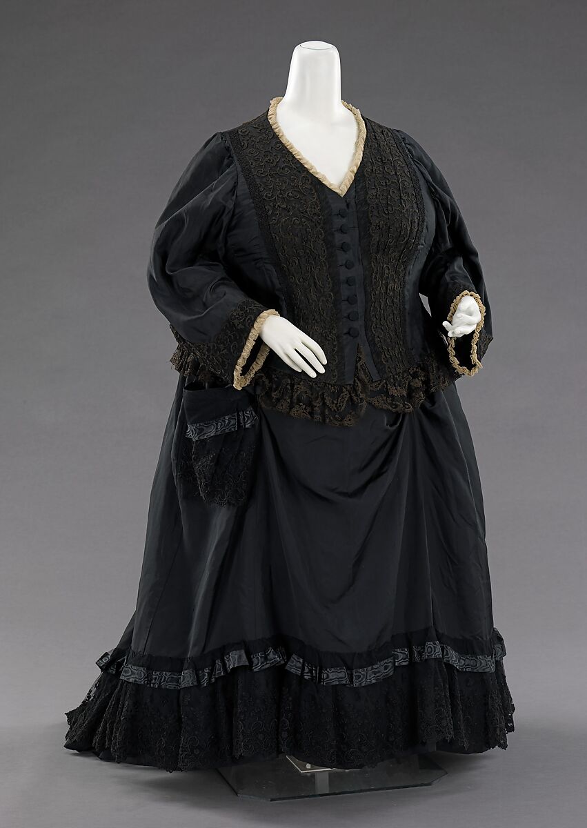 This dress was once worn by Queen Victoria (1819-1901) of the United Kingdom, as documented in an 1894 photograph of the Queen holding her great-grandson, Edward VIII (1894-1972). Purchased from an annual sale of the Queen's garments, it shows the traditional touches of mourning attire, which she wore from the death of her husband, Prince Albert (1819-1861), until her own death. The simple white trim and minimal use of crinkled crepe on the dress indicate a state of half mourning, although it is 33 years after her husband's death. The bodice is of a lighter material to allow for comfort during summer months and the entire garment is finely detailed inside and out.